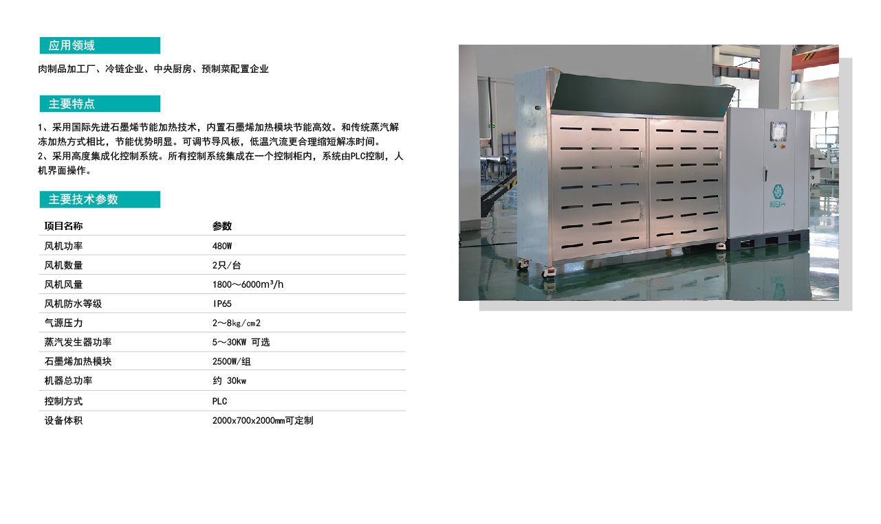 这台节能型保鲜解冻系统是一款技术先进、设计专业的工业级解冻装备。它通过石墨烯节能加热和智能化PLC控制两大核心技术,成功实现了高效、节能、高品质的解冻效果,完美契合了现代食品工业对提升效率、保障品质和降低运营成本的综合需求,是相关企业升级换代、实现智能化生产的理想选择。