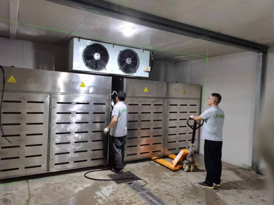 8月15日,开发完成的“石墨烯节能型保鲜解冻设备系统”,运抵江苏银宝央厨管理服务有限公司,和自兴专业施工团队顺利完成了该系统的现场安装、调试工作;临近开学的8月22日,和自兴技术部再次安排两名调试工程师做系统现场带肉调试,达到了系统具备单批次2~5吨肉制品解冻能力的要求。截止11月初,已完成50余批次、约130吨肉制品的顺利解冻,显示运行高效、系统安全、品质稳定,完全满足了中大型冷库肉制品高效解冻的需求,成功的案例给行业带来了市场新风。